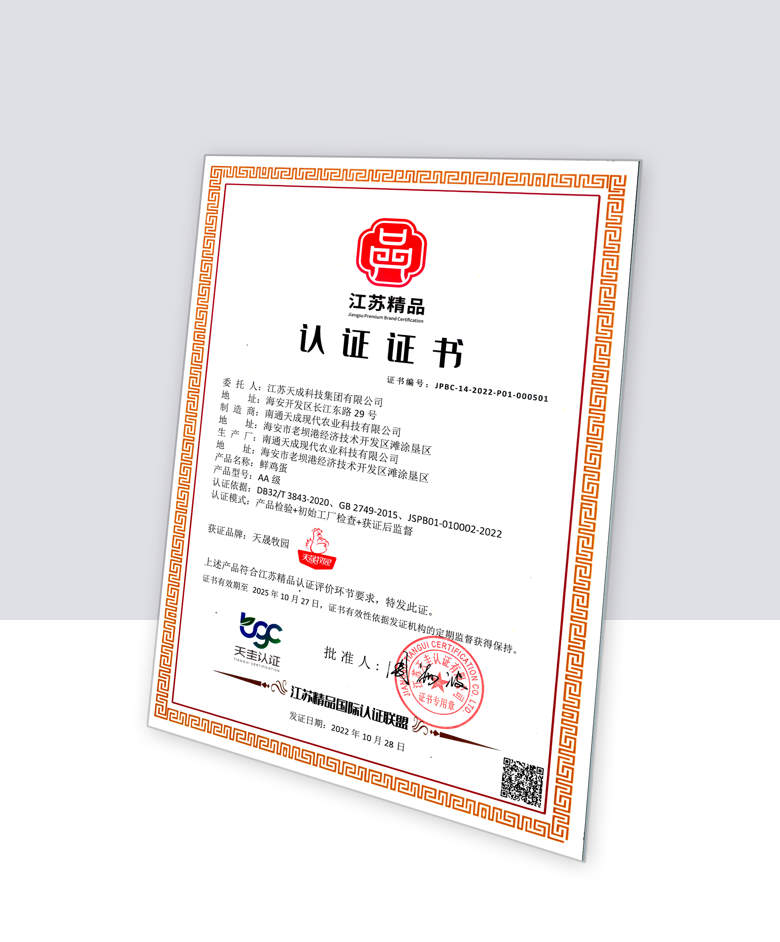 此次获得“江苏精品”荣誉,标志着天成集团作为国家级农业产业化重点龙头企业,在高质量发展上再进一步。天成集团也将以此为契机,进一步提升标准,当好蛋鸡行业高质量发展的领跑者,勇攀质量高峰,创民族品牌,让更多的产品成为“江苏精品”,实现质量更好、效益更高、竞争力更强的品牌战略!