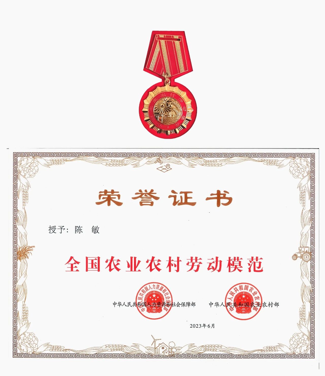 从人力资源社会保障部、农业农村部传来喜讯,天成集团总裁陈敏荣获“全国农业农村劳动模范”称号。