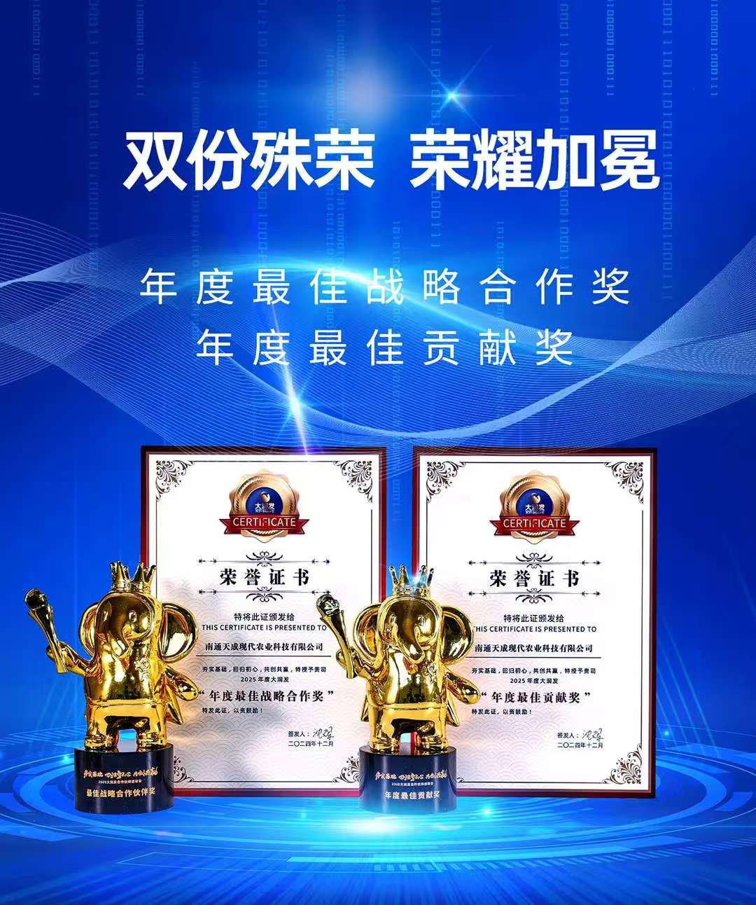 【概要描述】在大会中,天成集团凭借其多年来对大润发持续提供优质、安全、美味的品牌蛋及优质蛋液供应,以及对食品端严苛的把控和精益求精的态度,荣获了2024年大润发“年度最佳战略合作奖”“年度最佳贡献奖”的双项殊荣。